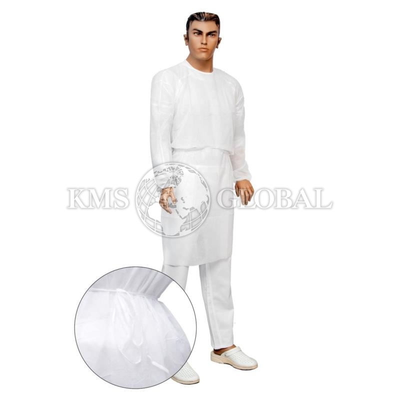Fartuch z włókniny PP o grubości 30g/m2 więzany na troki,bez kieszeni z gumkami przy mankiecie.